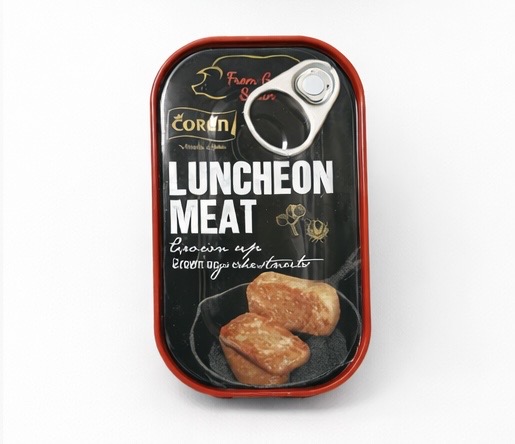 カルディの缶詰コーナーでひときわ目を引く、黒と赤のスタイリッシュなデザイン。中身は、スペインの希少な「ガリシア栗豚」を使用した贅沢なランチョンミートです。