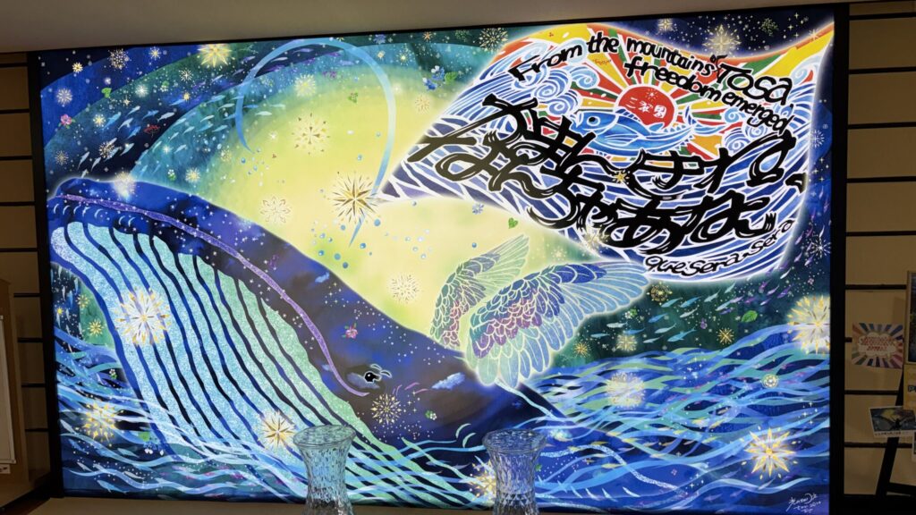 高知らしい力強いメッセージと、繊細な光のコントラスト。よく見ると、クジラの周りには土佐の魚たちや草花も散りばめられていて、まるで海と空が溶け合ったような不思議な景色です。