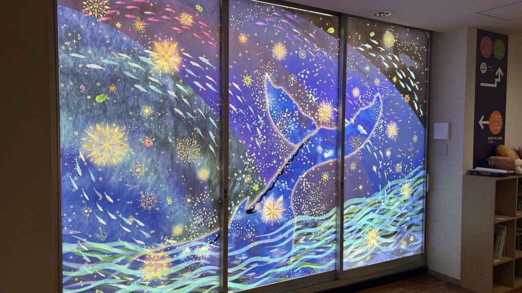 さらに、窓一面に広がる作品は、夜の静寂の中に星が降っているかのよう。光が透けることで生まれる色の深みは、写真では伝えきれないほどの美しさでした。